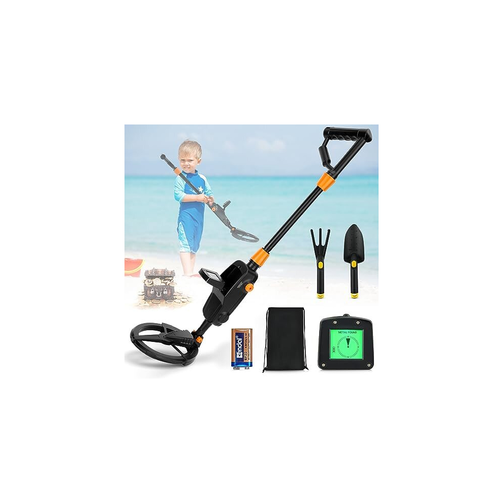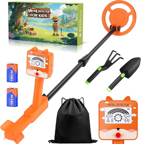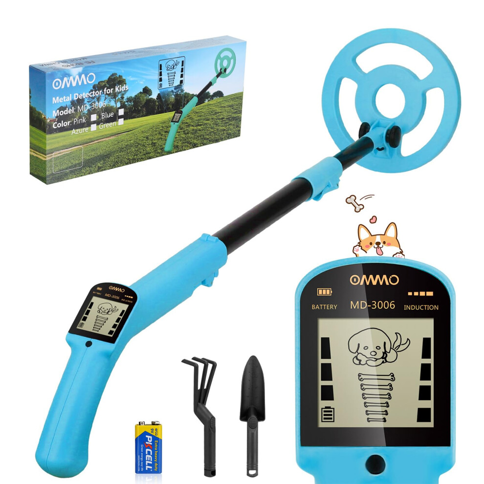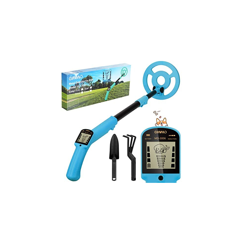 OMMO Metal Detector Kids, Adjustable Stem18.3''-37.8'' Metal Detectors with LCD Display, Lightweight Kids Metal Detector with 6'' Waterproof Search Coil, Beginners Gold Detector with Shovel and Rake