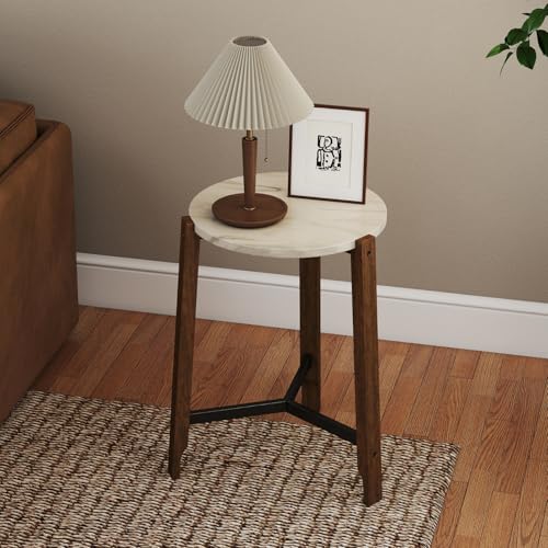CIMOTA Round Side Table, 22.5" End Accent Table with Solid Wood Leg, White Marble Texture Tabletop, Metal Beam, Round Nightstand for Small Spaces/Living Room/Bedroom, White