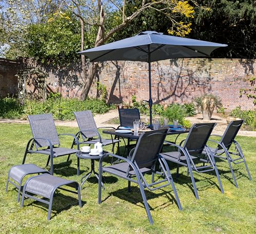 Hectare Polytex 8 Seater Metal Garden Furniture Outdoor Dining Set with Reclining Chairs and Parasol in Grey