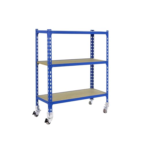 Simon Rack Garage Shelving Unit with Wheels 975x800x300 mm, 3 Tier Metal Rack with 16 mm MDF Shelves, 75 kg per Shelf, Blue/Wood – Maderclick