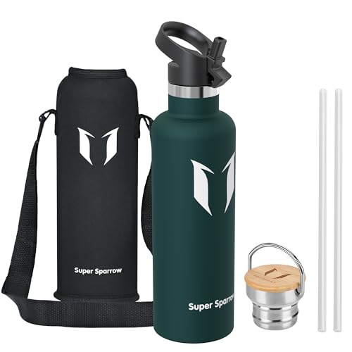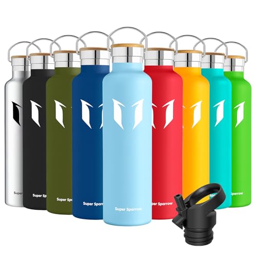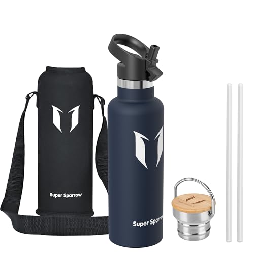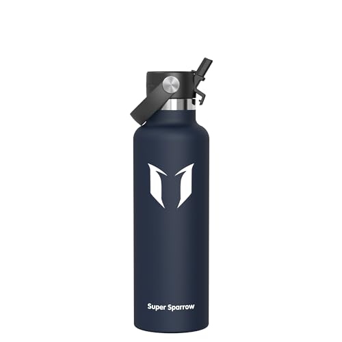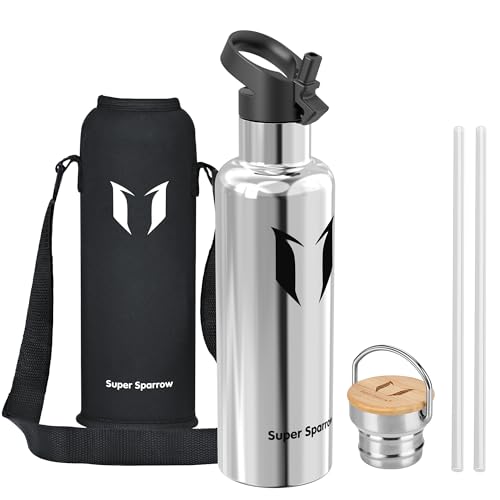 Super Sparrow Water Bottle Stainless Steel - 750ml - Insulated Metal Water Bottles - Standard Mouth Flask - BPA Free - Straw Bottle for Work, Gym, Sports - 2 Lids