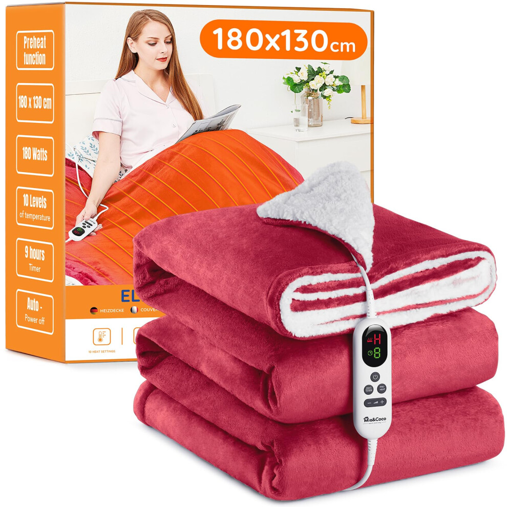 Mia&Coco Electric Heated Blanket Throw Flannel Sherpa Fast Heating 180x130cm, 10 Heat Levels & Up-to-9-Hours Auto-Off Timer & LED Display, for Home Office Use, Machine Washable, ETL Certified, Red