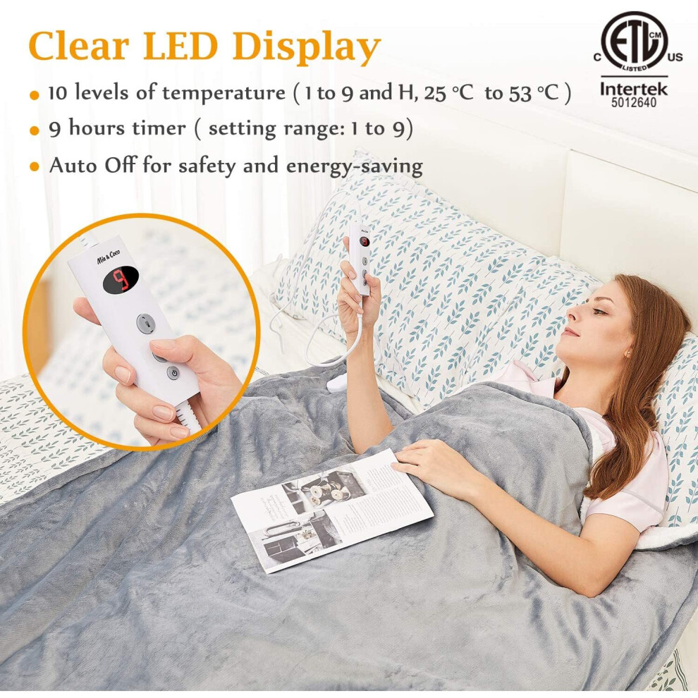 Mia&Coco Electric Heated Blanket Throw 120×160cm, Flannel Sherpa, Fast Heating, 10 Heat Levels, 9H Auto-Off, LED Controller, Overheat Protection, Machine Washable, ETL Certified, Grey