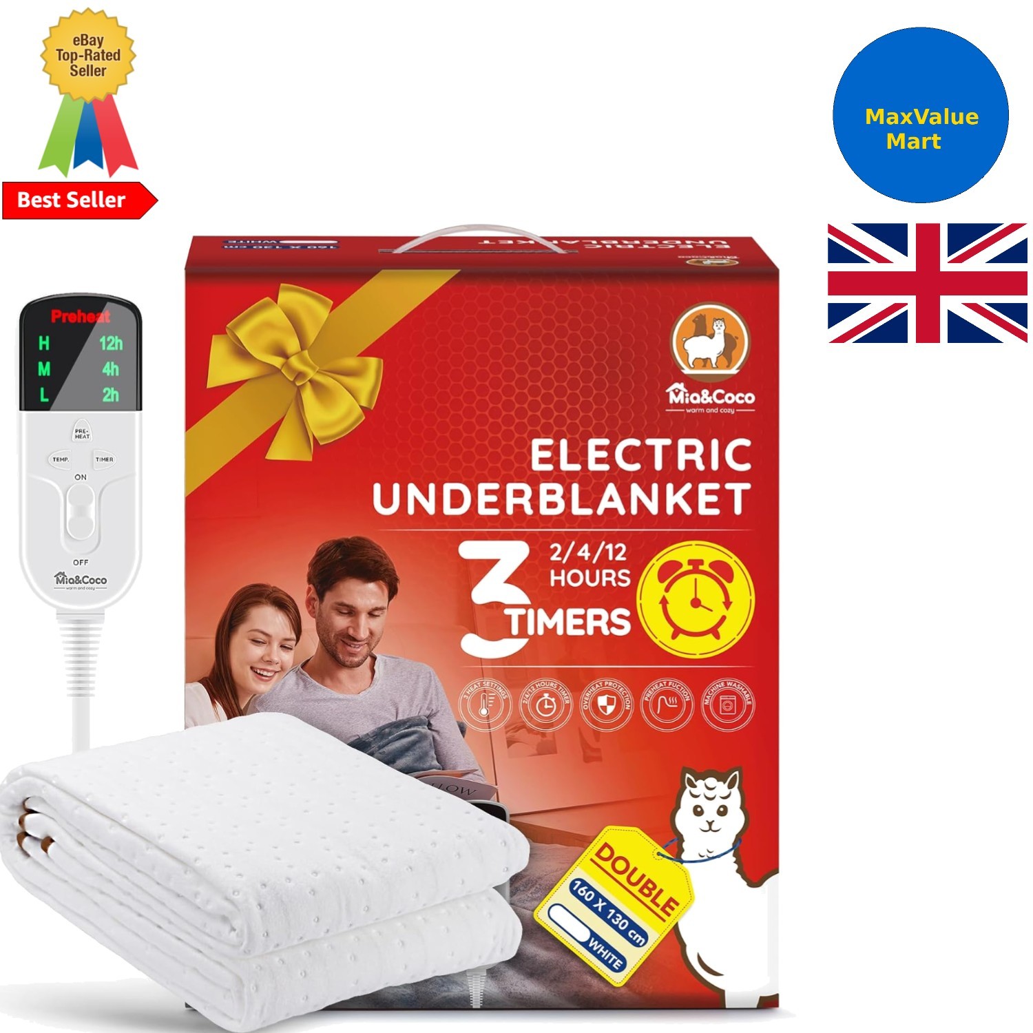 Mia&Coco Electric Heated Blanket Double, Heated Underblanket with 12hour Timers and 3 Heat Settings, LED Display, Overheat Protection Throw, Easy Fit