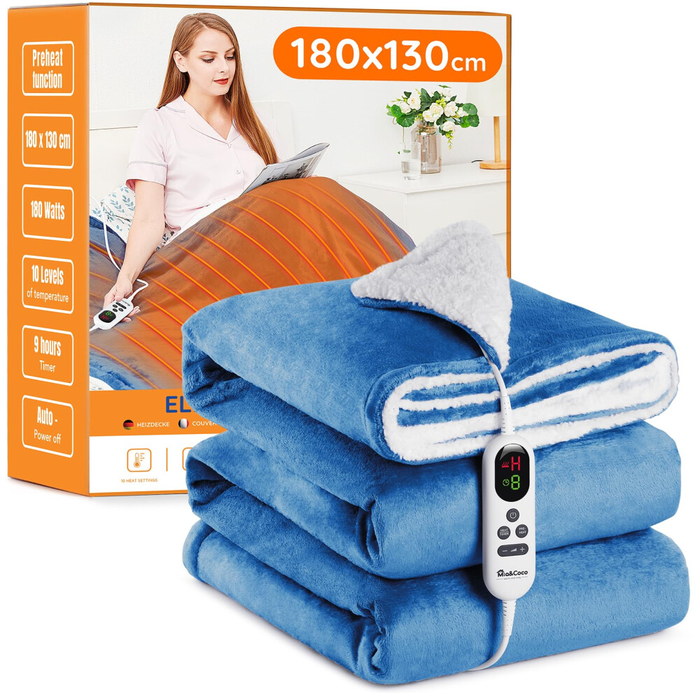 Mia&Coco Electric Heated Blanket Throw Flannel Sherpa Fast Heating 180x130cm, 10 Heat Levels & Up-to-9-Hours Auto-Off Timer & LED Display, for Home Office Use, Machine Washable, ETL Certified, Blue