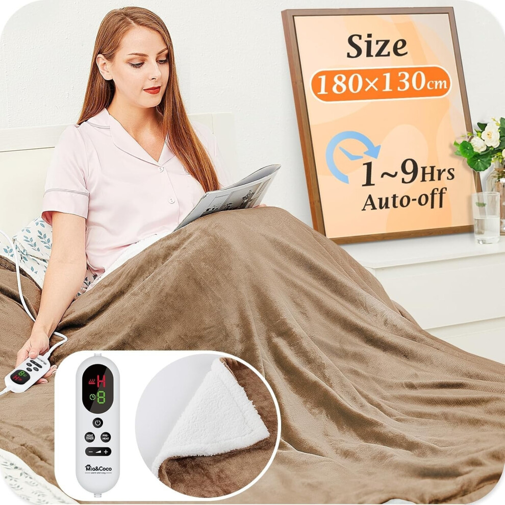 Mia&Coco Electric Heated Blanket Throw Flannel Sherpa Fast Heating 180x130cm, 10 Heat Levels & Up-to-9-Hours Auto-Off Timer & LED Display, for Home