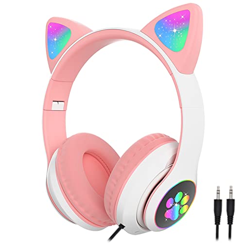 Sendowtek Wireless Headphones for Kids Adults, Over Ear Cute Cat Ear Earphone with Flashing Lights Built-in Mic Bluetooth Headphones for Kids Girls Boys(Pink)
