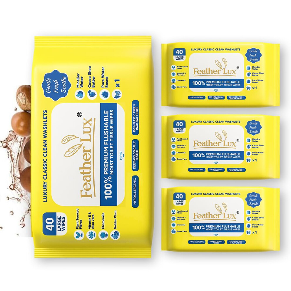 Feather Lux Wet Wipes for Adults - Flushable Toilet Wipes with Micellar Water, 160 Large Toilet Wipes Flushable(4 Pack of 40)Cocoa & Shea Butter,