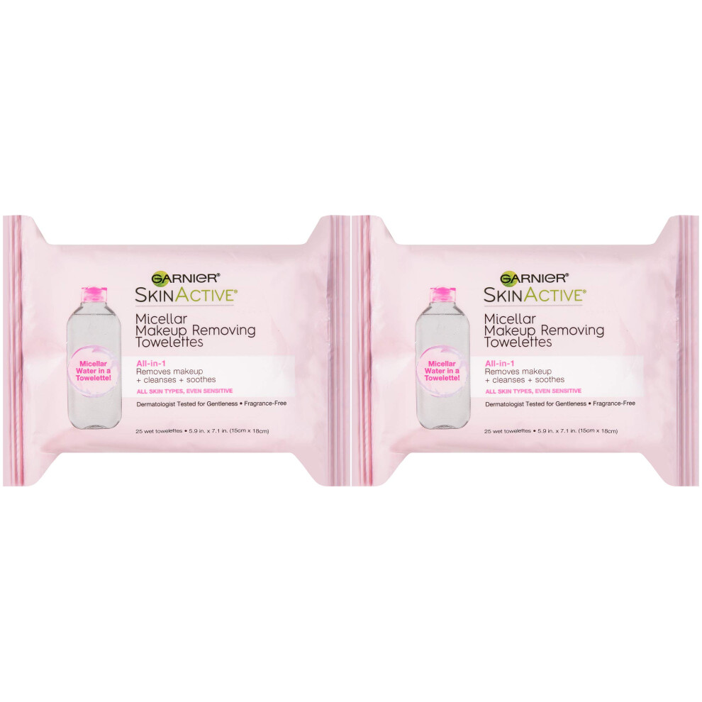 Garnier Micellar Facial Cleanser & Makeup Remover Wipes Gentle for All Skin Types (25 Wipes) 2 Count (Packaging May Vary)