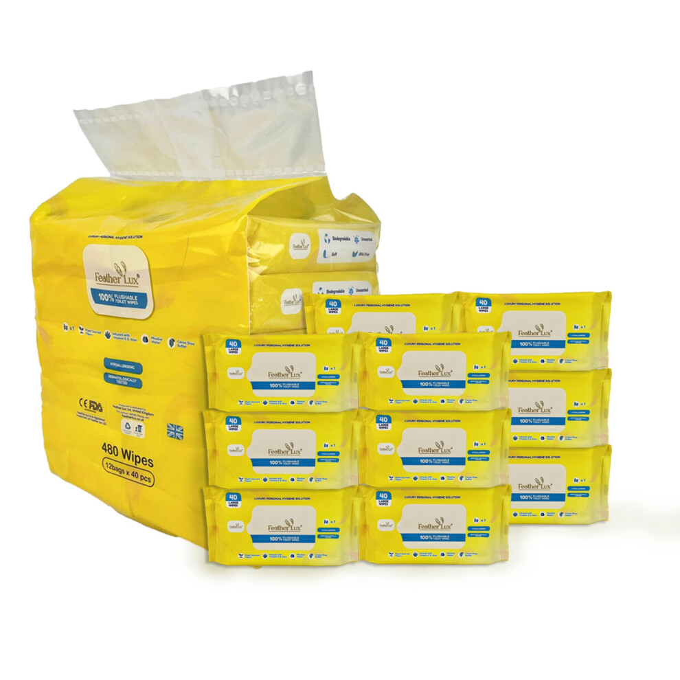 Feather Lux Wet Wipes for Adults - Flushable Toilet Wipes with Micellar Water, 480 Large Toilet Wipe Flushable (12 Packs of 40) Cocoa & Shea Butter,