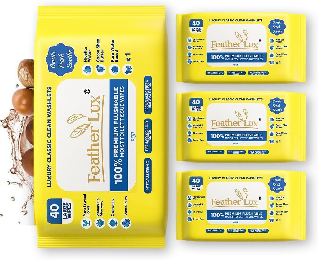 Feather Lux Wet Wipes for Adults - Flushable Toilet with Micellar Water, 160 Large Flushable(4 Pack of 40)Cocoa & Shea Butter,