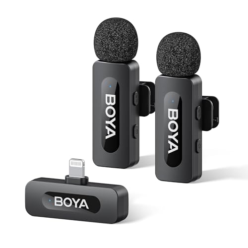 Boya BY-V2 Microphone Wireless for iPhone, Mini Microphone with Lightning Plug, 48KHz/16Bit, TX 9h, Noise Cancelling, USB-C Lavalier Wireless Mic, Mute Mode, 360° Clip on Lapel Mic for Video Recroding