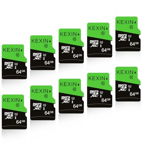 KEXIN 64GB Micro SD Cards SD Adapter 10 Pack MicroSDHC Memory Card Class 10 UHS-I External Micro SD Card TF Card for Tablet, Smartphone, Drone, Dash Cam, Camera, Monitor (64 GB, Black Green)