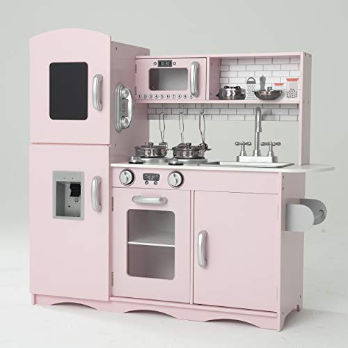 KIDOZ Signature Kids Wooden Kitchen, Large Pretend Role Play Kitchen With Realistic Oven, Microwave and Sink With Taps, Kitchen Playset With Sounds And Lights For Kids (Pink Kitchen With Utensils)