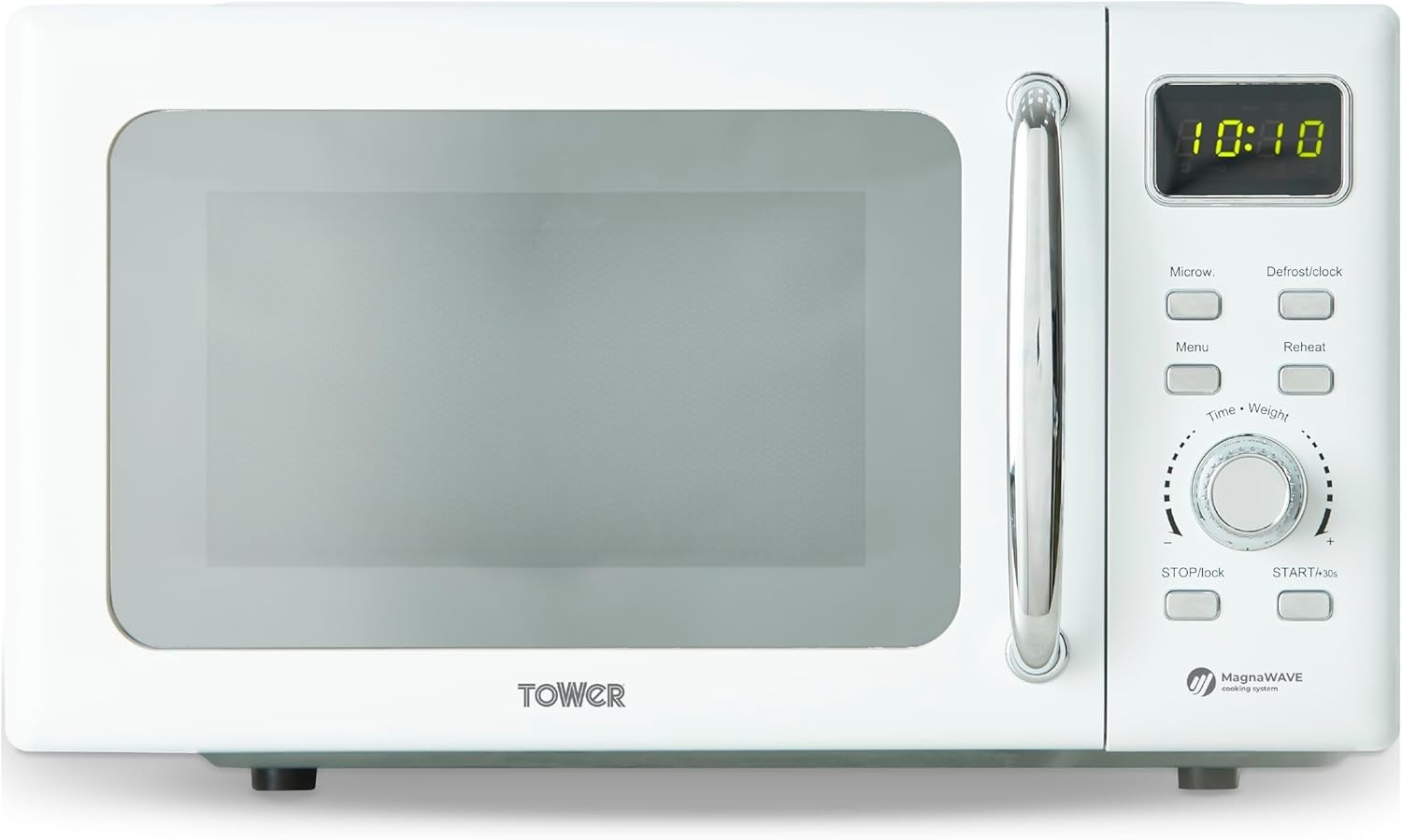 Tower T24041WHT Digital Microwave with Sleek Mirror Door, 800W, 20L, White & Chrome