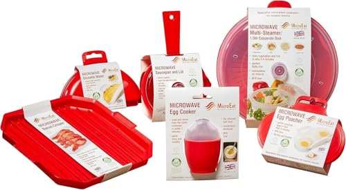 MicroEat 6-Piece Microwave Cooking Set - Includes Omelette Maker, Egg Poacher, Egg Cooker, Saucepan with Lid, Bacon Crisper and Multi Steamer BPA Free, Dishwasher Safe, Microwave Safe Made in UK Red