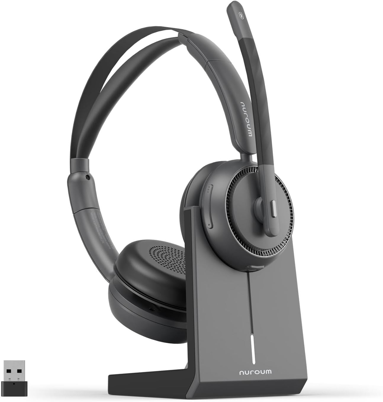 Nuroum HP31D(2nd Gen) Wirless Headset with Microphone, Noise Cancelling Mics for Work, Multi-Point, Charging Base, Mute Button, Bluetooth/Dongle/USB Connection to PC/Laptop/Phone for Zoom/Teams Calls