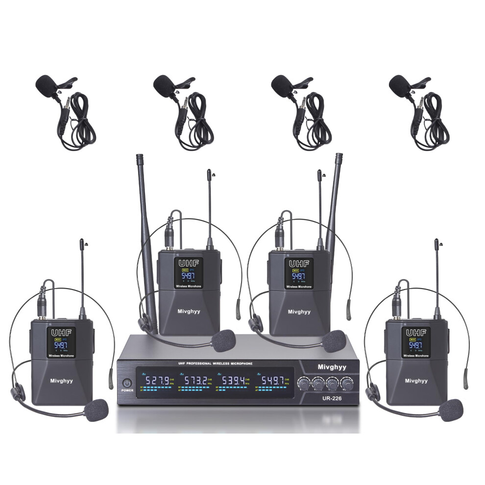 Wireless Microphones System with UHF Headset/Lavalier Lapel Mics Bodypack Transmitter 4 x 50 Channels 164ft Range for Church Conference Performance