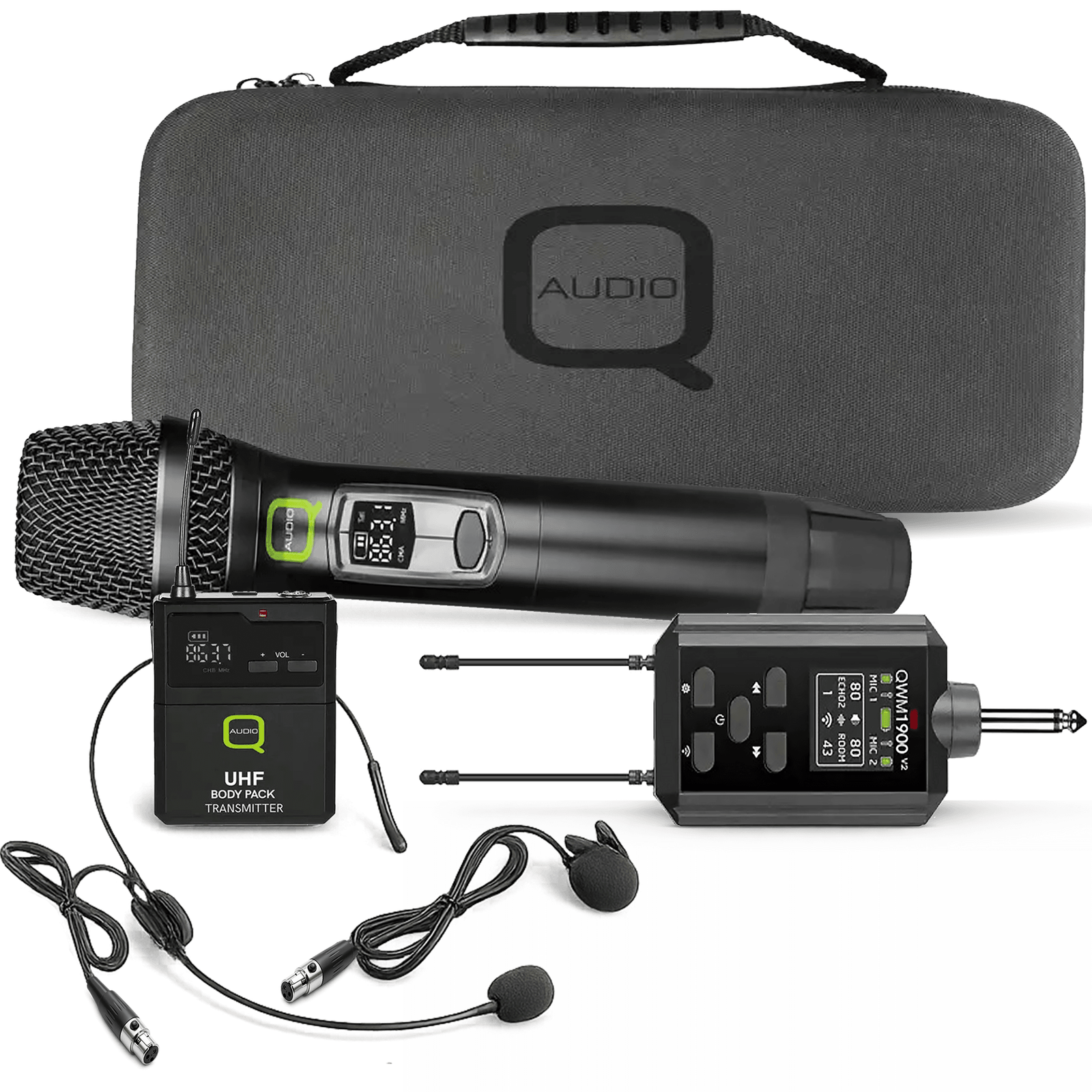 UHF Radio Microphone Dual System Q-Audio 1900HHBP V2 Handheld Lapel Headset Mics