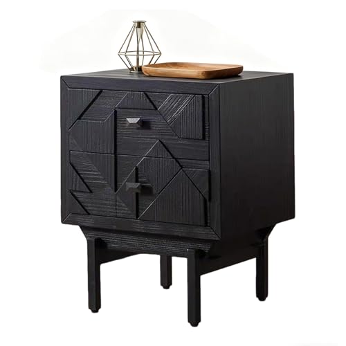 FGJKKRMI Boho Style Solid Wood Rattan Nightstand Mid Century Modern Side Table with 2 Drawers-Multipurpose Use Bedside End Table Wooden Night Stand for Living Room, Bedroom (Color : Black)