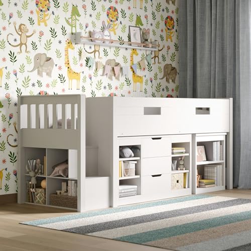 Noa and Nani Mid Sleeper Bunk Bed WHITE Pine Cabin bed with Slide + BLUE Design + Tunnel 6970WG-BLUE