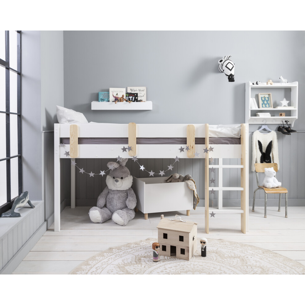 Moro Cabin Bed Midsleeper in Classic White - Solid Pine, Left or Right Angled Ladder, Fits 190x90 Mattress - Space Underneath for Play or Storage