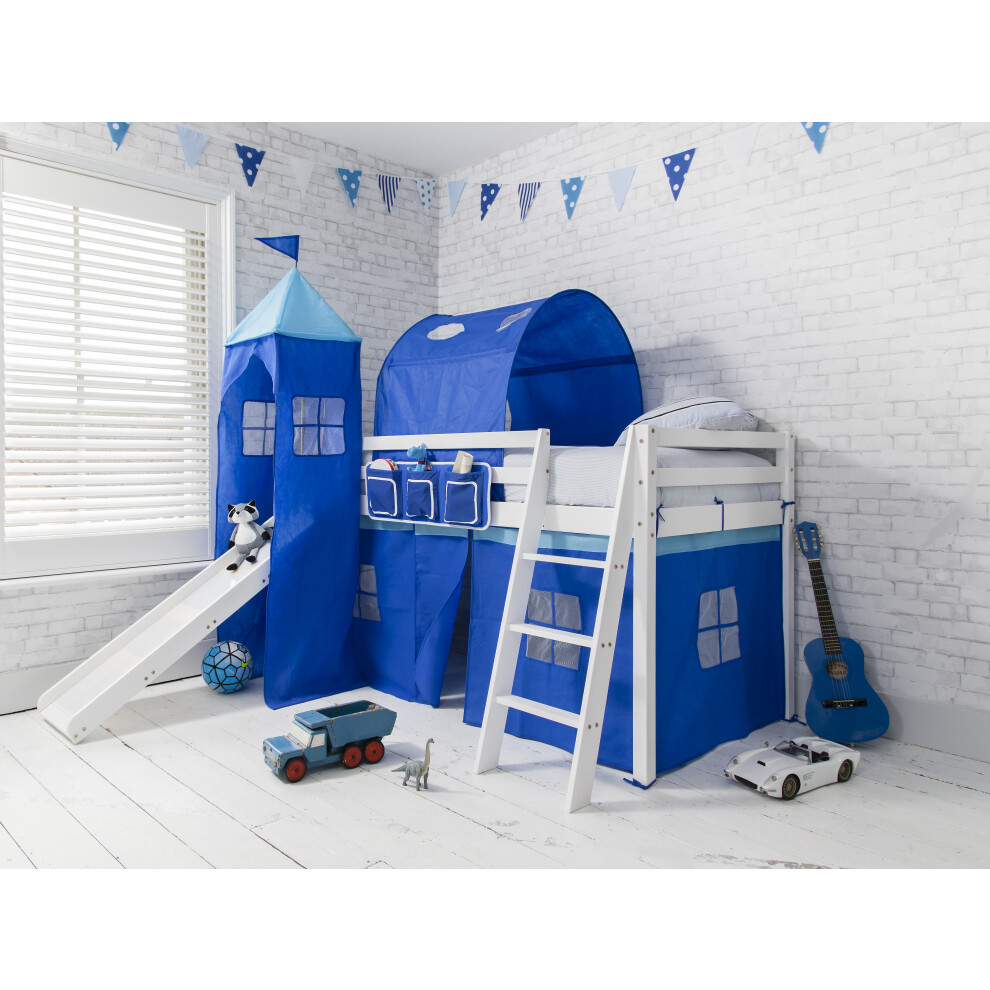Moro Cabin Bed Midsleeper with Slide Blue NW Package Classic White Solid Pine Hidden Storage and Secret Hideaway