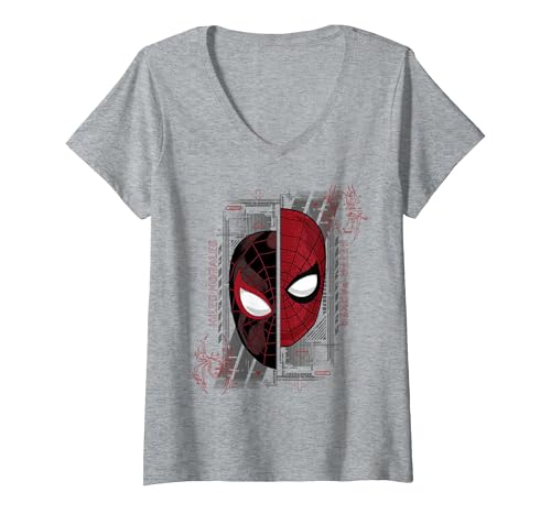 Women's Marvel Spider-Man Peter Parker & Miles Morales Split Mask V-Neck T-Shirt, Heather Grey, X-Large