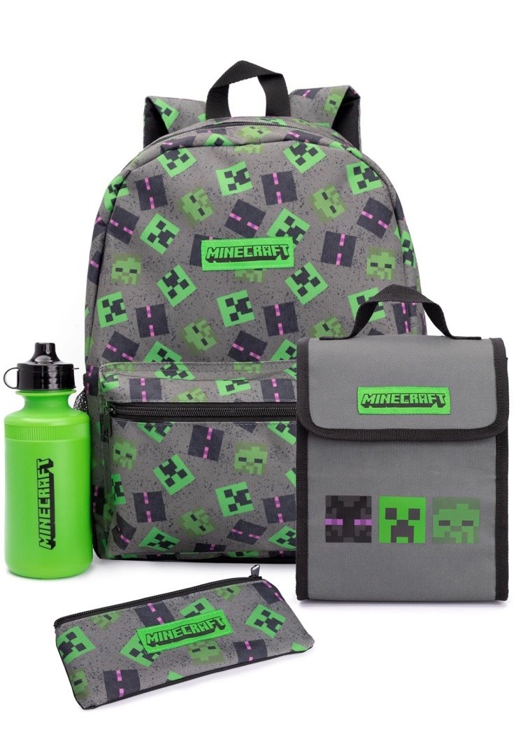 Minecraft Grey Creeper 4 Piece Backpack Set Boys, Rucksack, Packed Lunch Bag