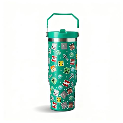 Minecraft 900ml Thermal Travel Mug Water Bottle Tumbler - Leakproof Straw & Lid - Stainless Steel Vacuum Insulated | Cold for 17Hrs - Hot for 5Hrs, Green
