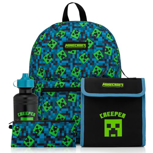 Minecraft Kids Backpack 4 Piece School Set Including Lunch Bag, Water Bottle and Pencil Case (Green)