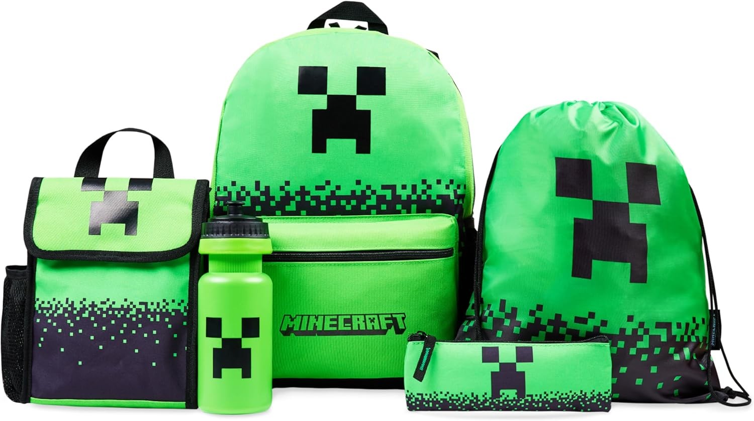 Minecraft Backpack Set 5 Pcs Water Bottle Insulated Lunch Bag Green Aop
