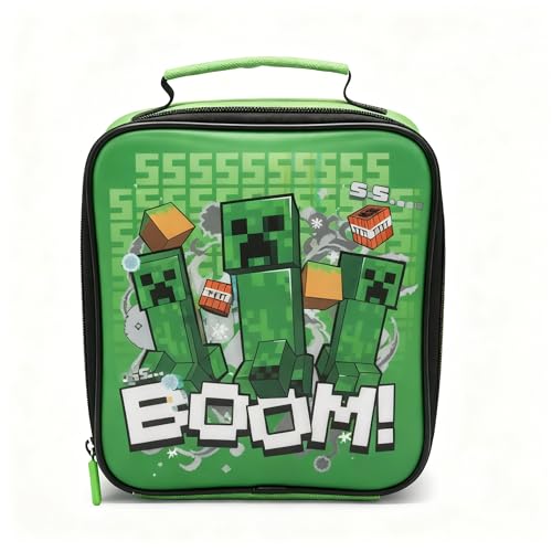 Minecraft Creeper Boom Insulated Lunch Bag Kids Green TNT Creeper Lunch Box Thermal School Food Bag with Carry Handle Wipe Clean BPA Free 23cm