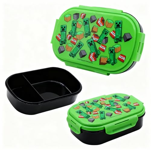 Minecraft Bento Lunch Box with Spork, Kids 2 Compartment Lunchbox with Secure 4-Latch Lid, Creeper TNT Grass Block Design, BPA Free Dishwasher Safe Food Container, Lunch Bag Friendly 23 x 20 x 8 cm