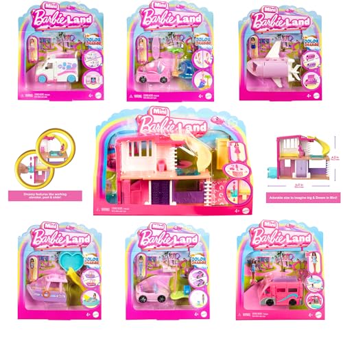 Barbie Mini Barbie Land 4-Pack Doll & Toy Vehicle Set with 4 1.5-inch Dolls & 4 Iconic Toy Vehicles with Color-Change Surprise, JGL30
