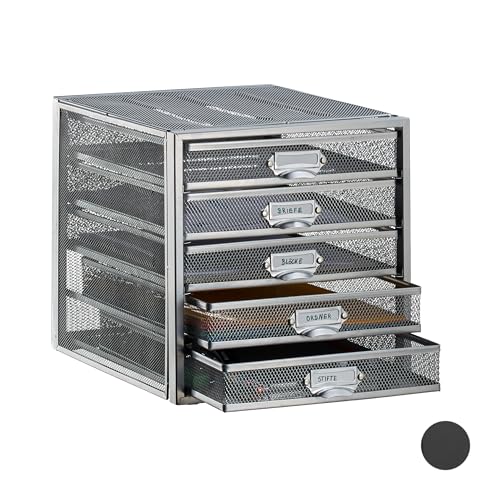 Relaxdays Desk Organiser, 5 Drawers for DIN A4 Files, Letter Tray and Paper Sorter, Mini Chest of Drawers, Silver