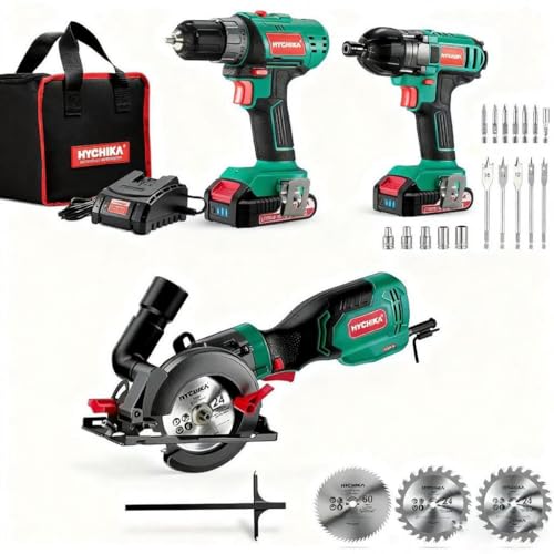 HYCHIKA Power Tool Combo Kit, Screwdriver 35 N.m + Impact Driver 160 N.m + 750W Mini Circular Saw Corded with 3 Blades, Power Tools Set for Home Garden Outdoor