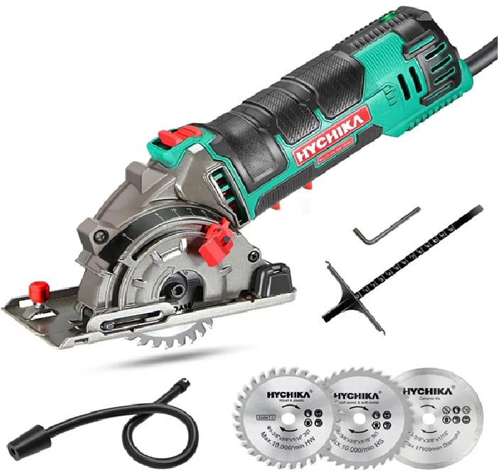HYCHIKA Mini Circular Saw, with 3pcs Blades (85mm), Scale Ruler, 500W Pure Copper Motor, 4500RPM Ideal for Wood, Soft Metal, Tile and Plastic Cuts