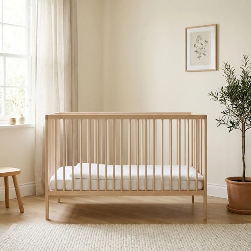 Mokee Mini Cot Bed Natural Cot - Space Saving Wooden Crib with Adjustable Height - Converts to Toddler Bed - Scandinavian Design Cotbed in Untreated Beechwood (Natural Beech)