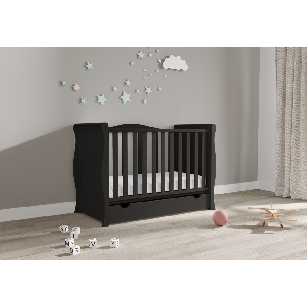 Viculii Willow Baby Sleigh Mini Cot Bed with Drawer Only | 120x60cm | 3 in 1 Baby Cot Converts to Toddler Bed Junior Bed (Black)