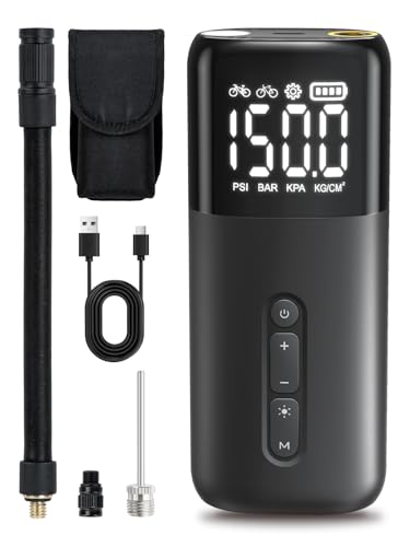 Senelux Mini Electric Bike Pump 150 PSI Cordless Portable Air Compressor with Digital Pressure Gauge, Auto Stop & Smart Presets, USB-C Rechargeable for Road Bike with Presta & Schrader Valve