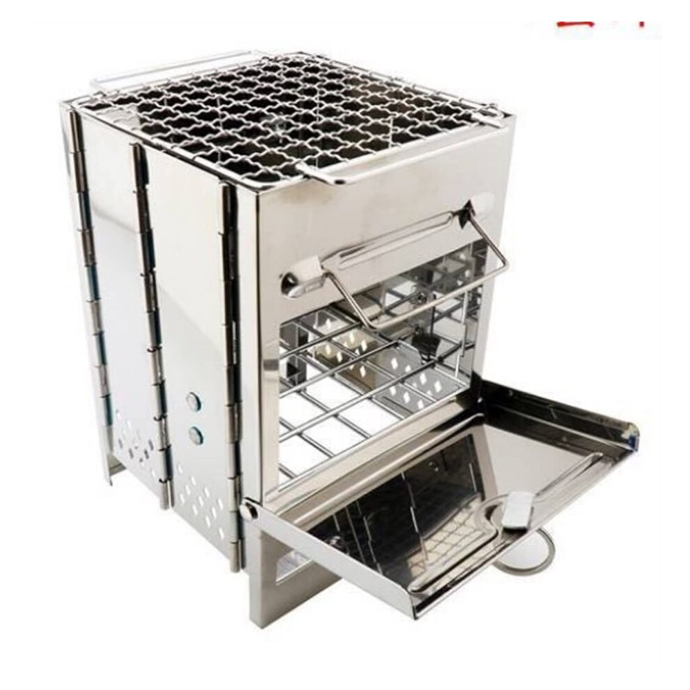 Camping Wood Stove Outdoor Mini Square Grill Oven Portable Wood Stove Stainless Steel Folding Charcoal Stove (Size: Fixed 15 x 15 x 21 cm)