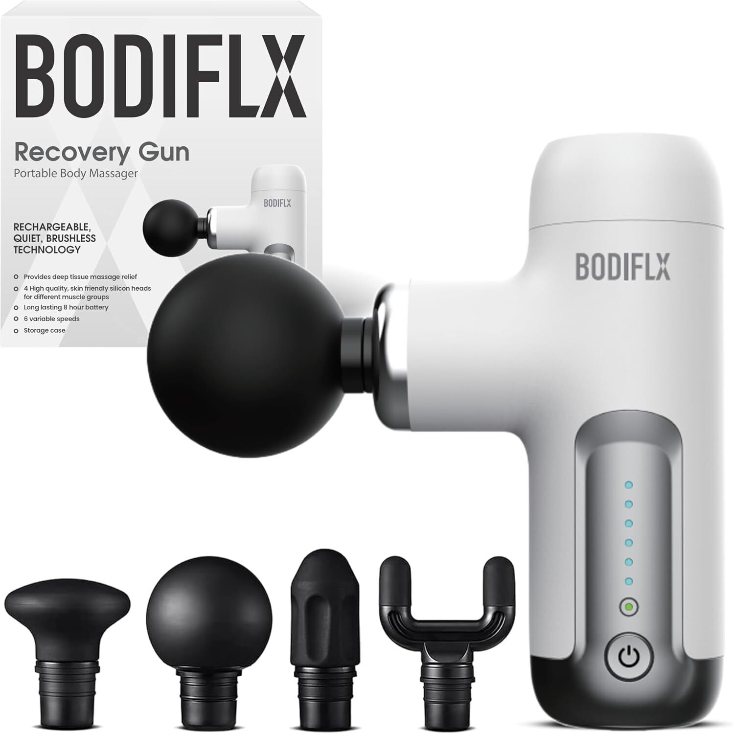 BODIFLX Recovery Gun, White, Portable Mini Muscle Massage Gun - Handheld Deep T