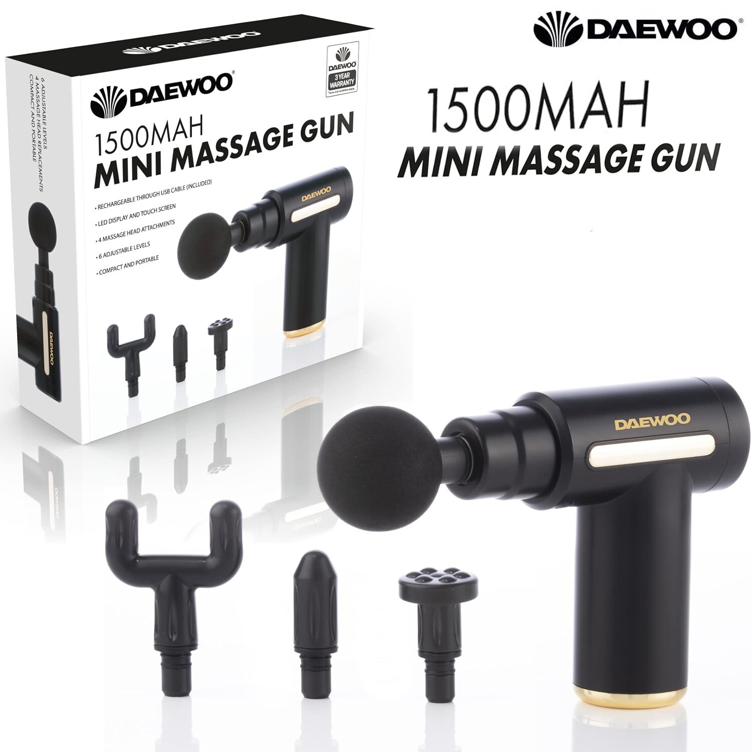 Daewoo Rechargeable 1500MAH Mini Massage Gun 4 Massage Heads & Pain Relief Gun