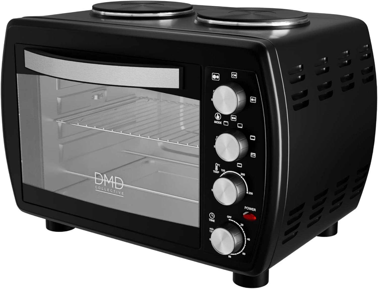 DMD Collective - 35L Mini Oven with Dual Hot Plates, Electric Countertop Cooker, 100-250°C Temperature Control, 120min Timer, Wire Rack, Baking Tray & Rotisserie Fork, Energy-Efficient