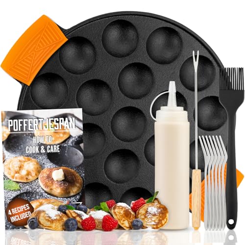 IRONO Poffertjes Pan - Mini Pancake Maker - Pancake Pan - 19 Mini Pancakes - Eggs Crepe Pan - Cast Iron - Includes Brush, Turning Fork, Batter Bottle, 6 Forks, Handles