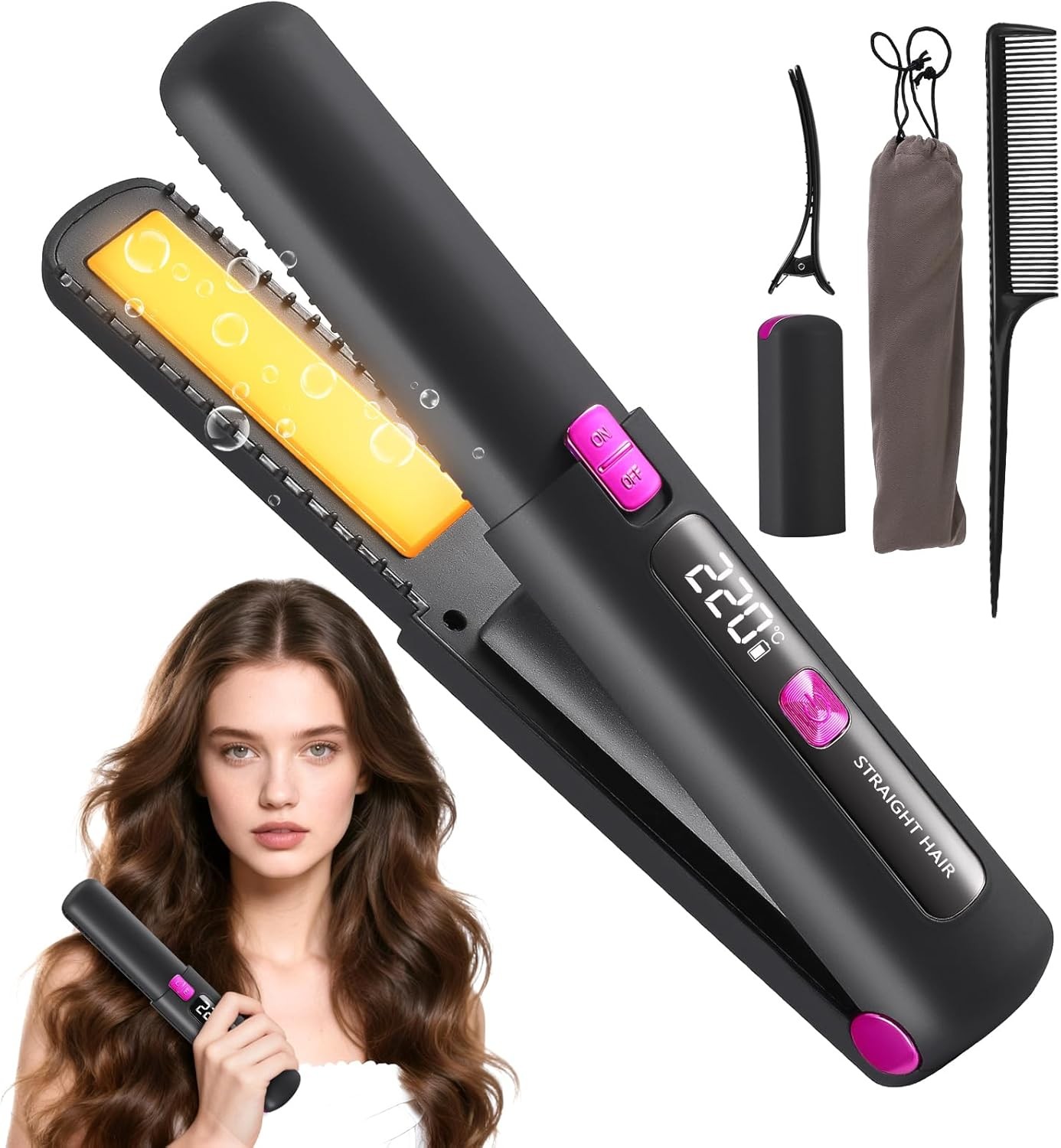 Hot Comb,2-in-1 Mini Hair Straightener,30s Fast Heating Cordless Hair Straighteners,3-Speed Temperature,USB Rechargeable,2000Mah (Black)