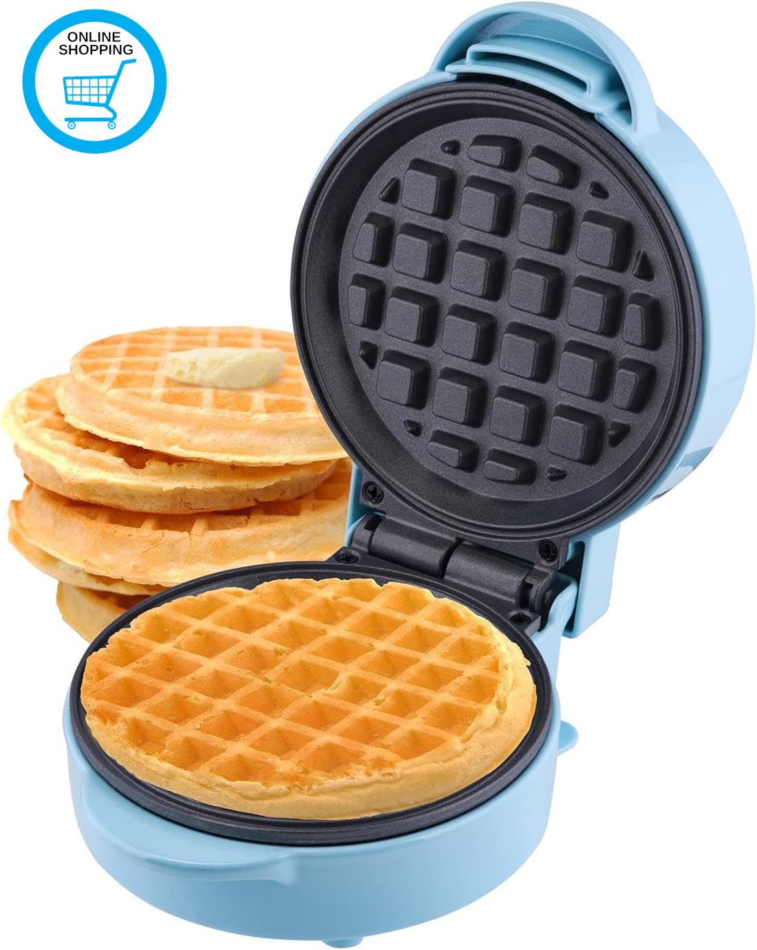 Giles & Posner Mini Waffle Maker – PFAS-Free Non-Stick Waffle Iron Machine, Belgian & American Style Waffles, Sweet/Savoury Snacks Desserts, Compact, 11.5 cm Round Cooking Plate, Matt Blue