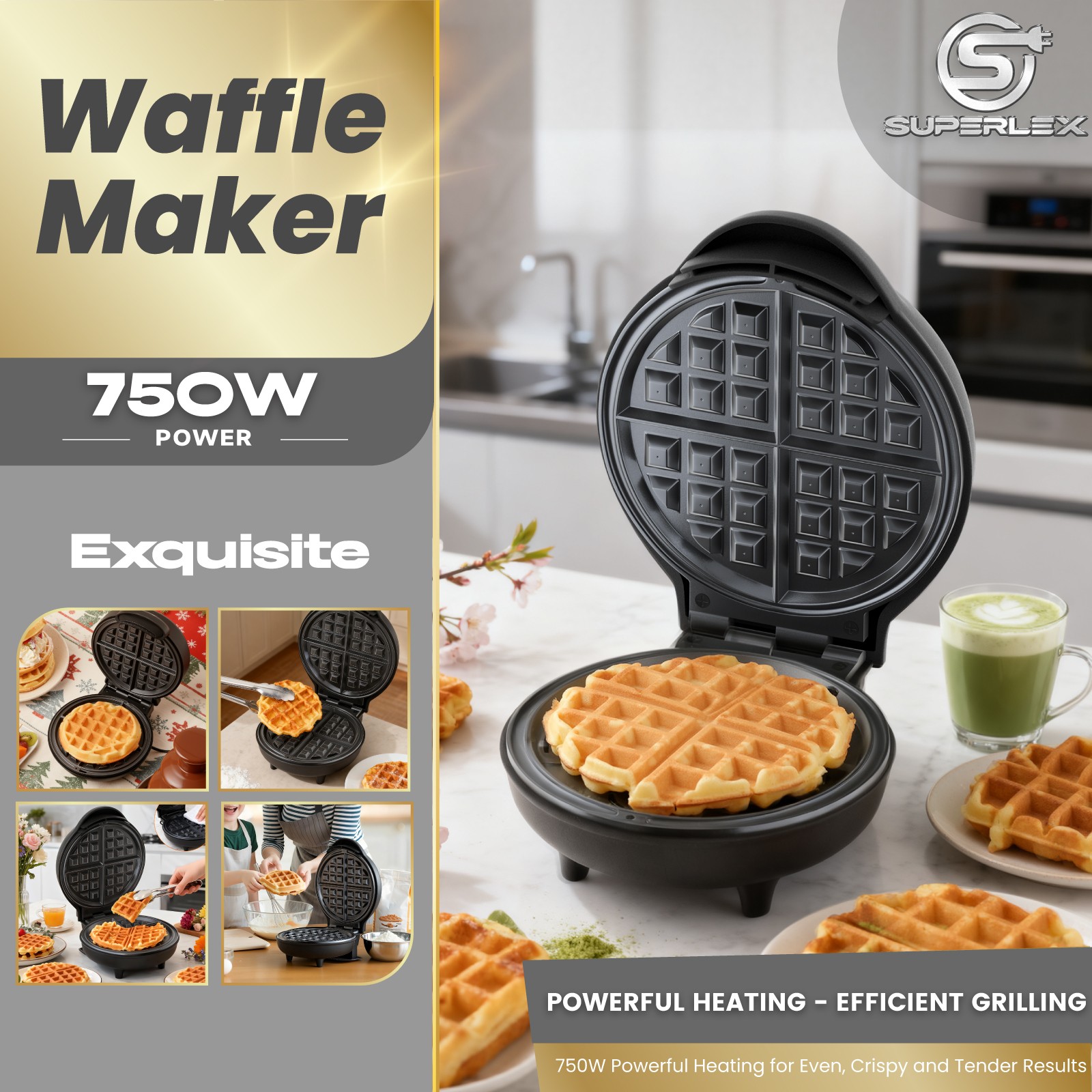SUPERLEX 750W Mini Waffle Maker Machine Round Non-stick Coating Electric Black