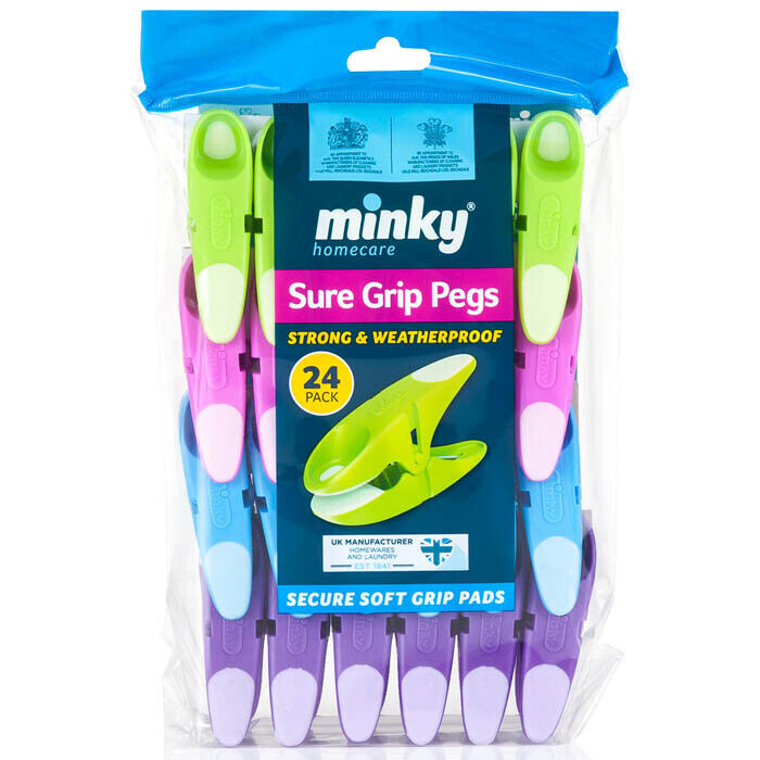 Minky Sure Grip Laundry Pegs (Pack of 24) - Waterproof, UV-Stable, Rust-Resistant Springs, Wide Jaw, Anti-Marking Pads, UK Designed